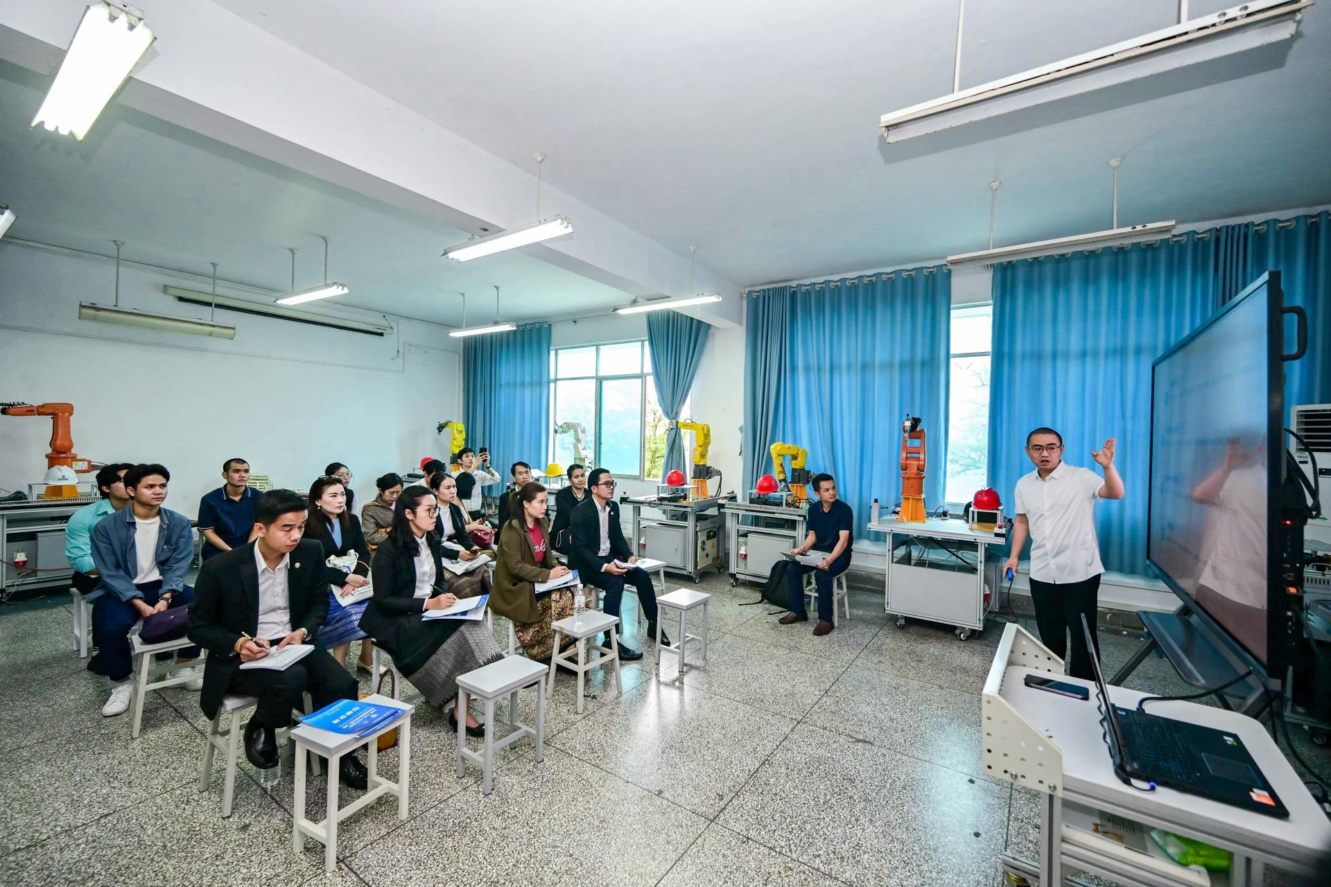 本次培训通过需求精准对接、资源高效整合与文化技术融合三大策略确保实效:前期深入调研老挝《2025数字经济战略》及重点产业政策,针对性设计工业机器人、智能产品开发等核心课程模块;联动发那科、华为等企业共建"设备共享池",提供价值300万元的实训设备支持,破解硬件资源瓶颈;创新"技术汉语+文化体验"教学模式,将专业术语学习与书法艺术等文化课程有机融合,既提升技术传授效率,又增强了跨文化认同感,实现"技能提升"与"文化共鸣"的双重目标。