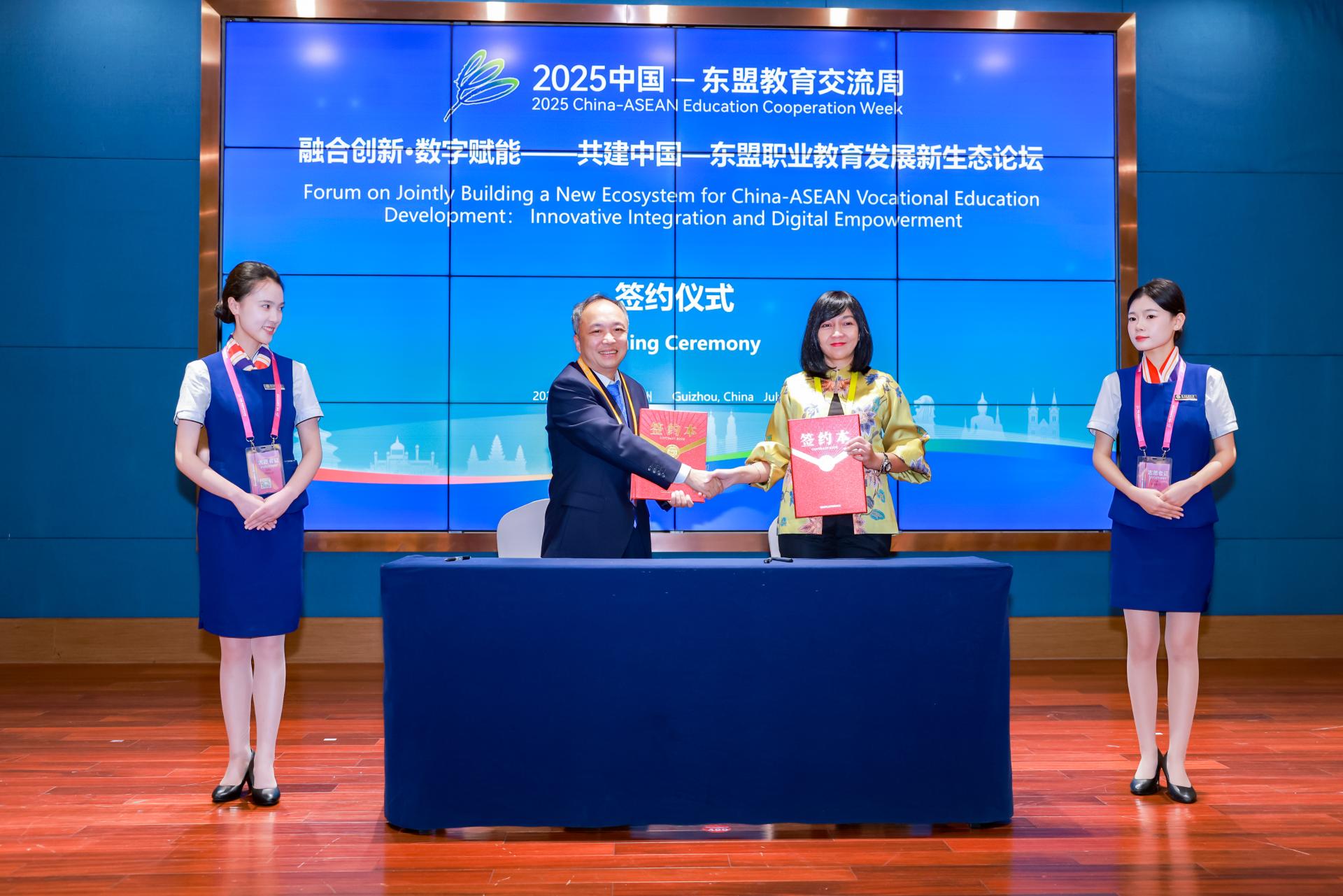 论坛项目成果有:(一)展示数字化平台。一是介绍建筑AI大模型。二是推广中国—东盟多彩智慧学院。三是推广中国—东盟技术教育合作平台(CATECP);(二)签署合作备忘录5份。贵州建设职业技术学院与印度尼西亚玛琅国立理工学院,黔东南民族职业技术学院与柬埔寨国立理工学院,贵州航天职业技术学院与印度尼西亚玛琅国立理工学院,毕节工业职业技术学院与泰国清迈职业技术学院,贵州经贸职业技术学院与印度尼西亚玛琅国立理工学院分别签署了教育合作备忘录;(三)中国—东盟国际青年交流活动受到广泛关注。