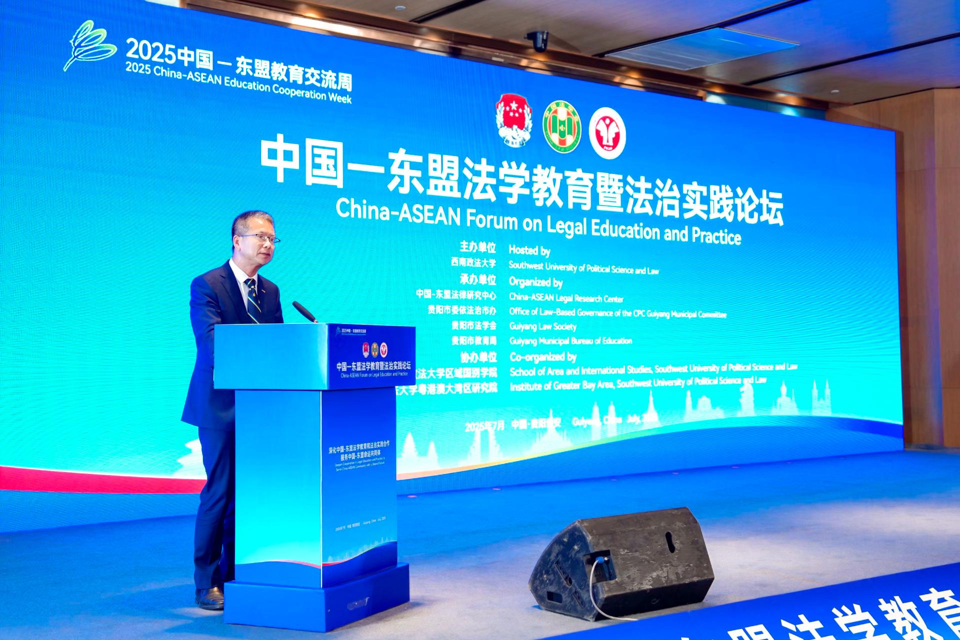 7月27日,中国—东盟法学教育暨法治实践论坛在贵安新区成功举行。聚焦“深化中国—东盟法学教育和法治实践合作,服务中国—东盟命运共同体”主题展开对话探讨,更好服务“一带一路”倡议,促进中国与东盟国家在法学教育和法治实践领域进一步加强交流互鉴,推动建设更紧密的中国—东盟命运共同体。论坛由西南政法大学主办,中国—东盟法律研究中心、贵阳市委依法治市办、贵阳市法学会、贵阳市教育局共同承办,并得到西南政法大学区域国别学院、粤港澳大湾区研究院、西部陆海新通道法治研究院等单位的协办支持。