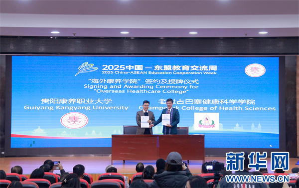 随后,贵阳康养职业大学与老挝占巴塞健康科学学院举行了“海外康养学院”签约及授牌仪式,双方在师资培养、课程共建与学生交流等方面正式达成合作。